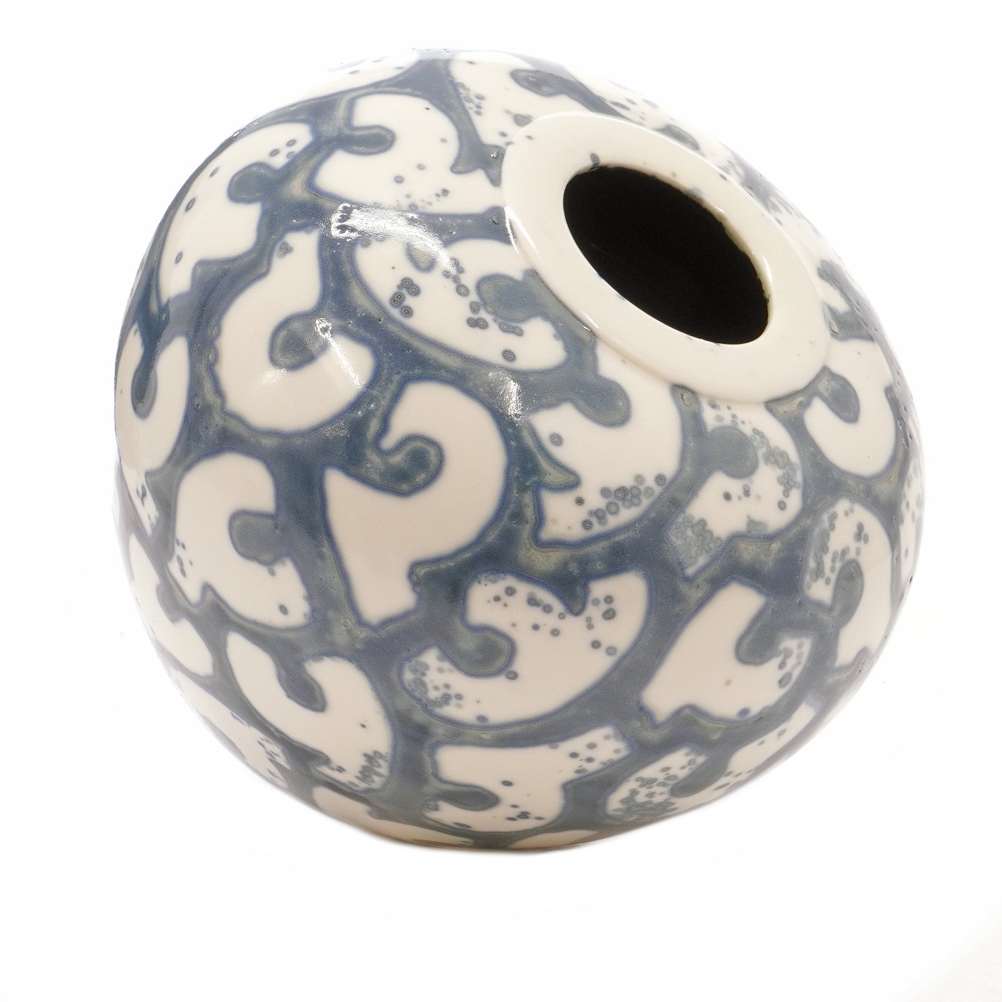 Per Weiss vase. Per Weiss, 1953-2023, vase i stentøj med blå glasur og geometrisk mønster. H: 20cm. D: 20cm