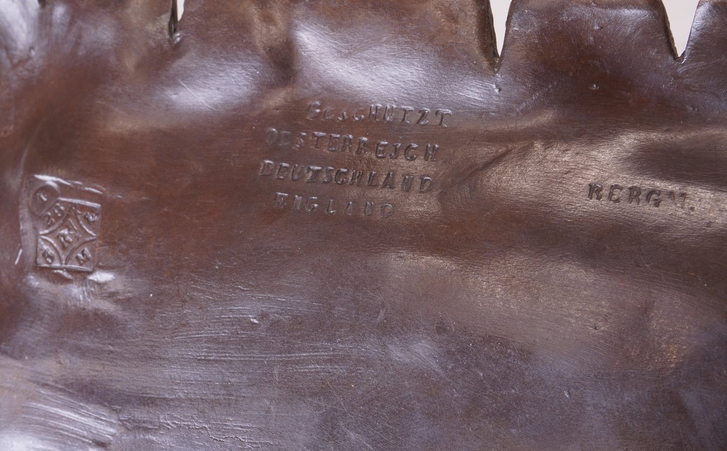 Stor wienerbronze i form af hund med taske på tæppe. Visitkortholder(?). Stemplet. H. 12cm. Base: 19x15,5cm