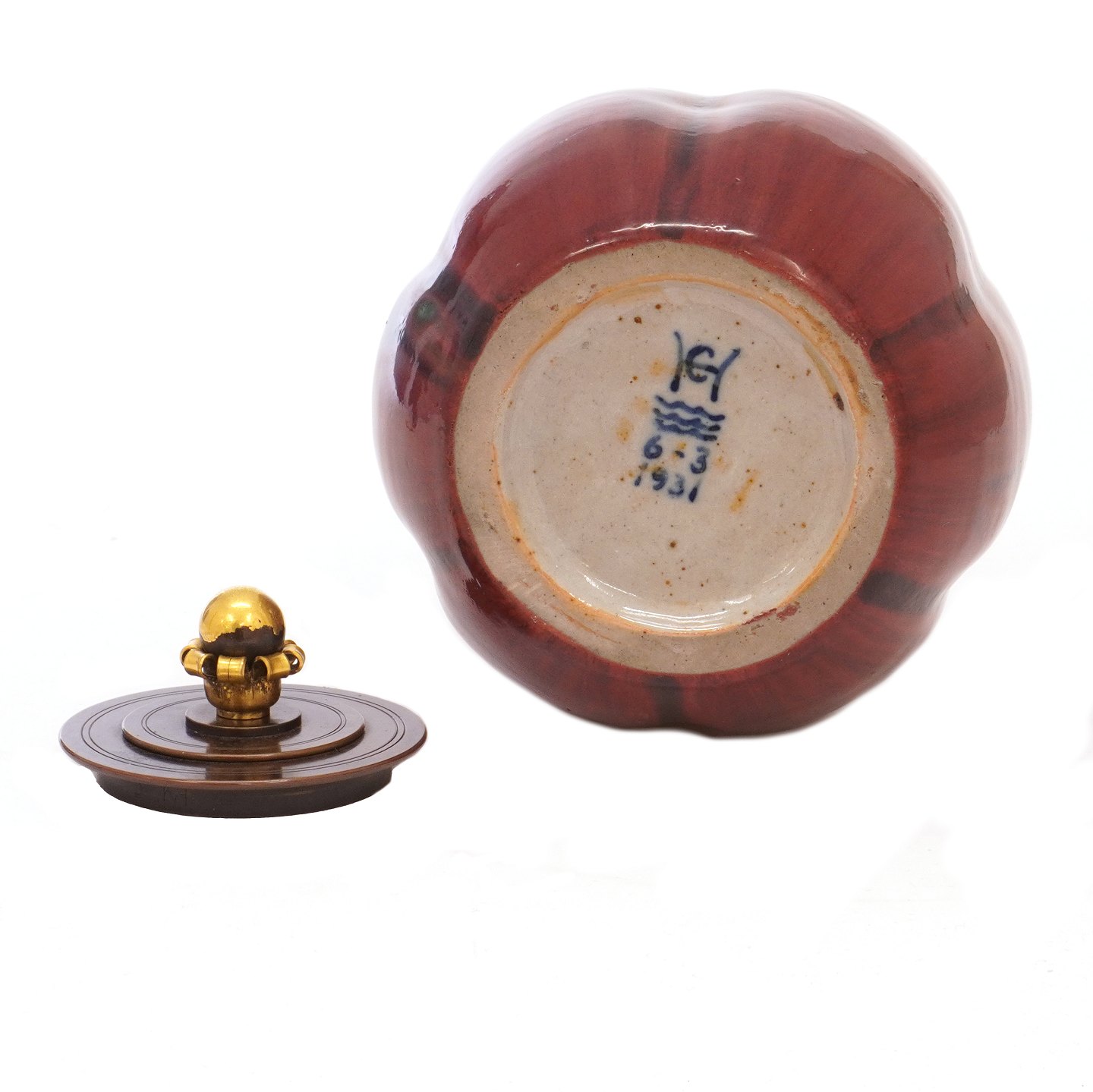 Carl Halier stentøjsvase med okseblodsglasur og bronzelåg af Knud Andersen. Signeret Carl Halier 6-3 1931. H: 15,5cm