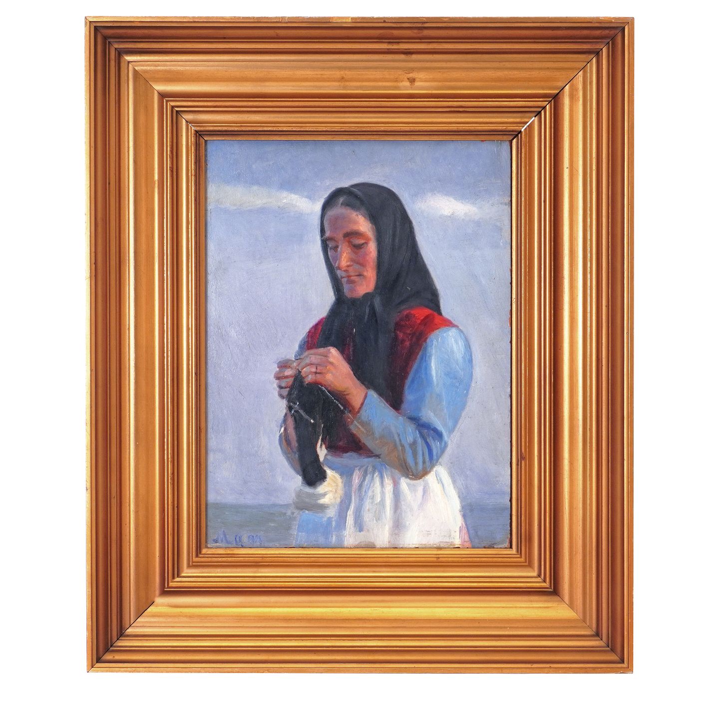 Michael Ancher portræt af strikkende kvinde på strand. Michael Ancher, 1949-1927, olie på træ. Signeret "MA 99". Lysmål: 32x24cm. Med ramme: 50x42cm